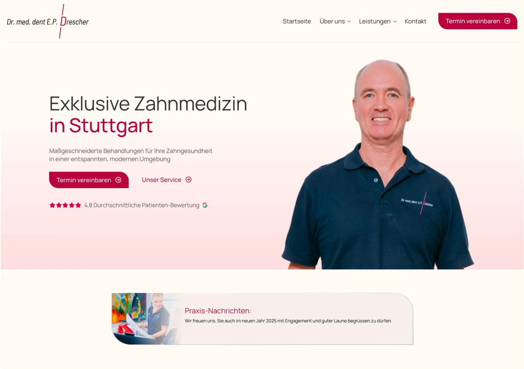 Die Zahnarztpraxis Dr. Drescher in Stuttgart bietet hochwertige zahnmedizinische Leistungen in einem modernen und patientenorientierten Umfeld. Für eine klare Kommunikation des breiten Behandlungsspektrums und zur Gewinnung neuer Patienten benötigte die Praxis eine professionelle, einladende Online-Präsenz. Nach Jahren mit einer veralteten Website wandte sich das Team an uns, um eine moderne, benutzerfreundliche und SEO-optimierte Lösung zu realisieren.